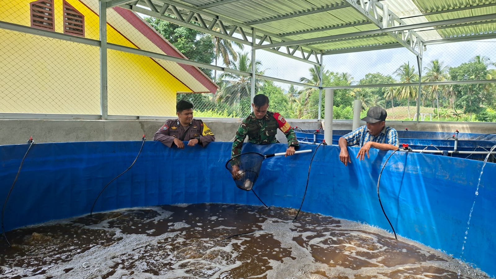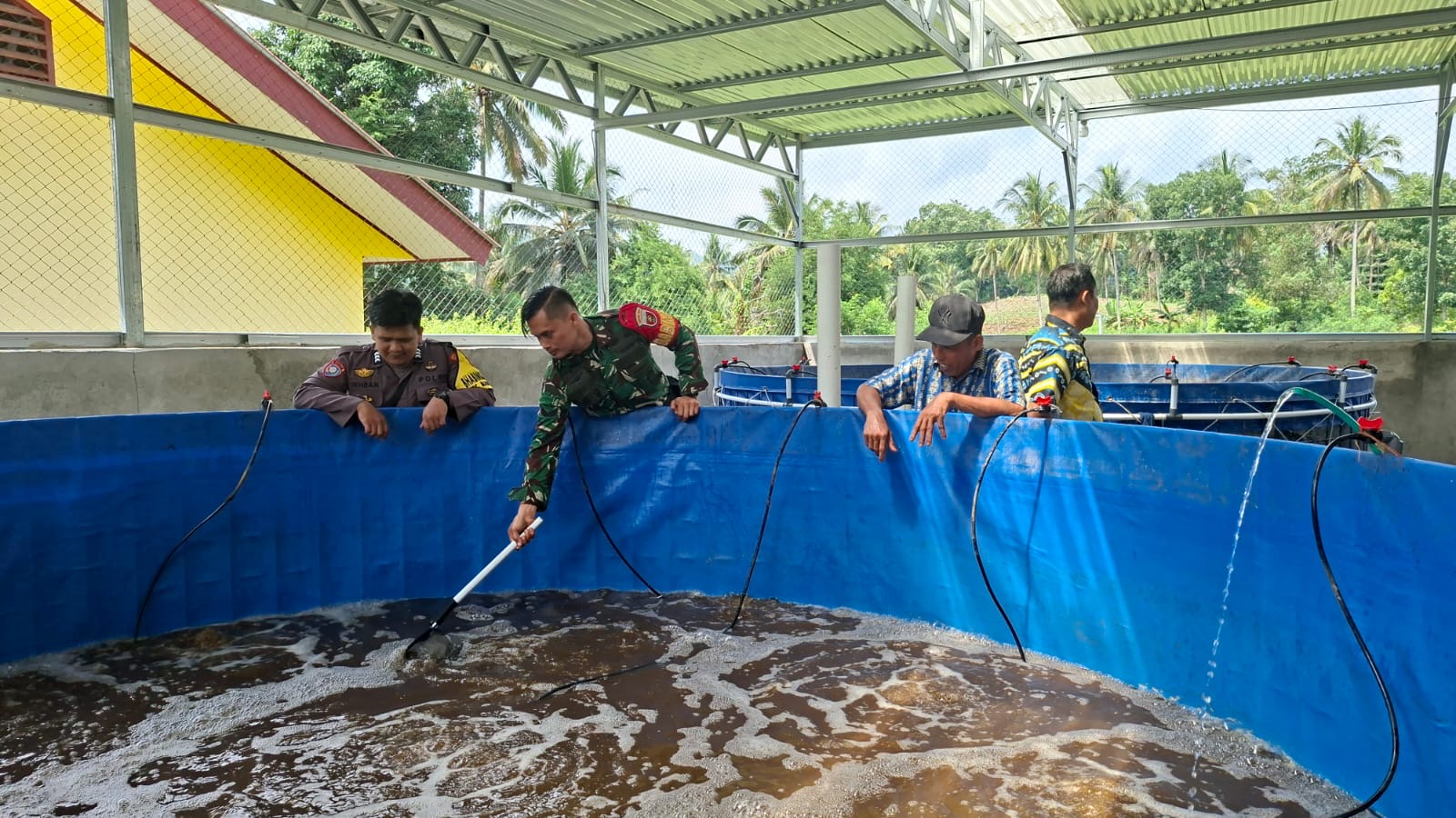 Sistem budidaya ikan bioflok adalah cara memelihara ikan di kolam dengan memanfaatkan bakteri, untuk mengolah kotoran dan sisa pakan menjadi pakan alami. Dengan sistem ini, air kolam tidak perlu sering diganti, ikan tetap sehat, dan hasil panen bisa lebih banyak meski kolam berukuran terbatas. Budidaya ikan nila sistem bioflok ini didanai melalui Dana Desa sebesar Rp 264 juta sebagai bagian dari program ketahanan pangan desa.