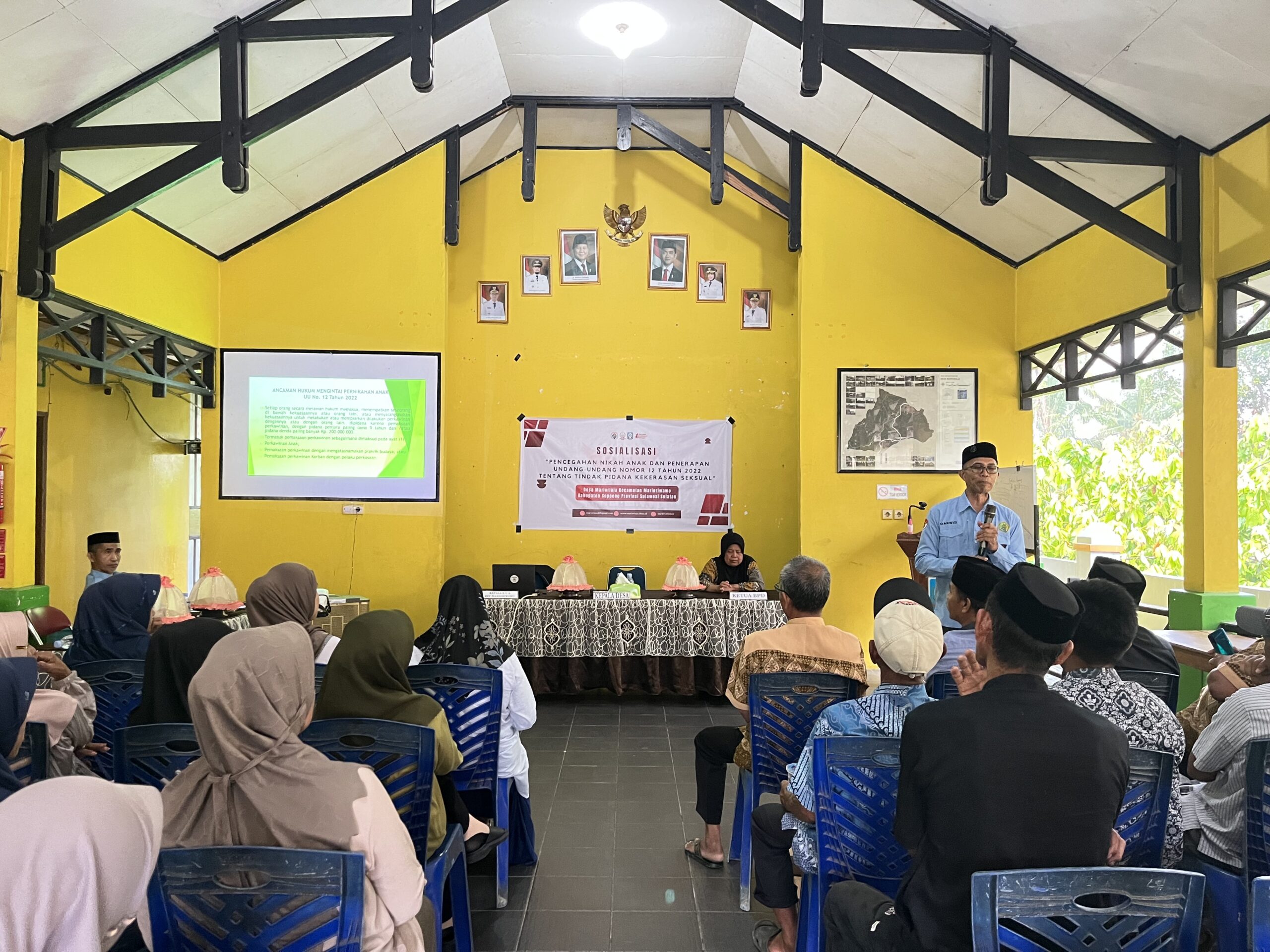 Kegiatan Sosialisasi Pencegahan Perkawinan Anak dan Tindak Pindana Kekerasan Seksual oleh KUA Kecamatan Marioriwawo. Sosialisasi ini bertujuan meningkatkan kesadaran, pengetahuan, dan komitmen semua pihak untuk melindungi anak melalui edukasi hak anak, dampak negatif, serta undang-undang terkait seperti UU Nomor 12 Tahun 2022 tentang Tindak Pidana Kekerasan Seksual. Sosialisasi ini juga menekankan pentingnya peran keluarga, sekolah, dan masyarakat dalam menciptakan lingkungan aman dan mengedukasi anak tentang batasan tubuh. Kegiatan ini dihadiri oleh BPD Desa Marioriaja, Kepala Dusun, Ketua LPMD, Ketua RT RW, TP.PKK Desa Marioriaja, Imam Masjid, Majelis Taqlim serta Tokoh Masyarakat, Tokoh Adat dan Tokoh Pemuda.